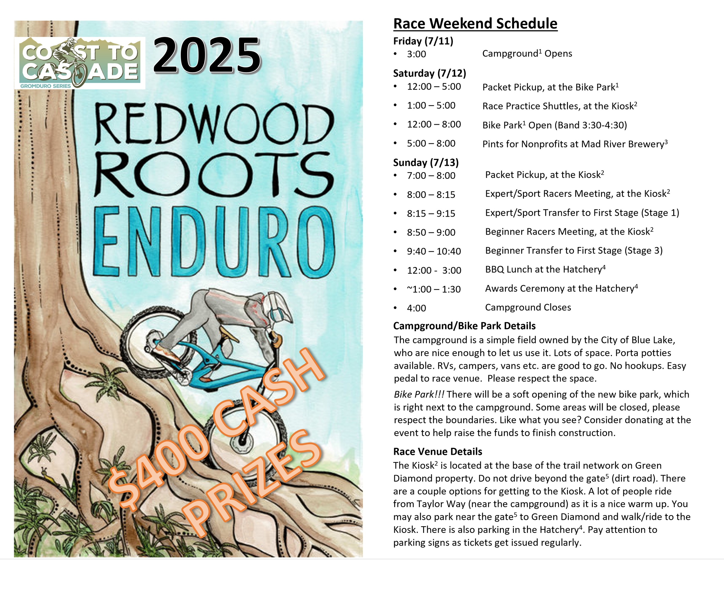 June 29, 2025 - Map, profiles, and stage descriptions have been uploaded. The racer package and weekend schedule will be uploaded within the next week. For now, use these as a guideline: Camping (free and near the race) will open Friday at 3PM, Practice Shuttles will be on Saturday from 1-5, the Race Meeting will be held on Sunday at approximately 8AM, Race approximately 9-12, Lunch and Awards will be approximately between 12-2. Our goal is to have families traveling from out of the area on the road at a decent hour.