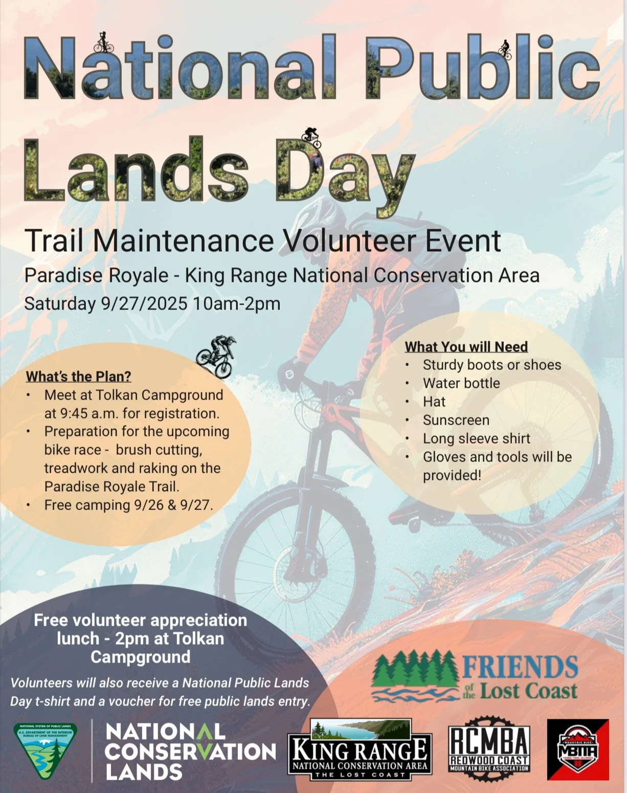 Meet at Tolkan Campground at 9:45 a.m. for registration. The workday will focus on preparation for the upcoming Paradise Royale MTB Race (October 11, 2025).