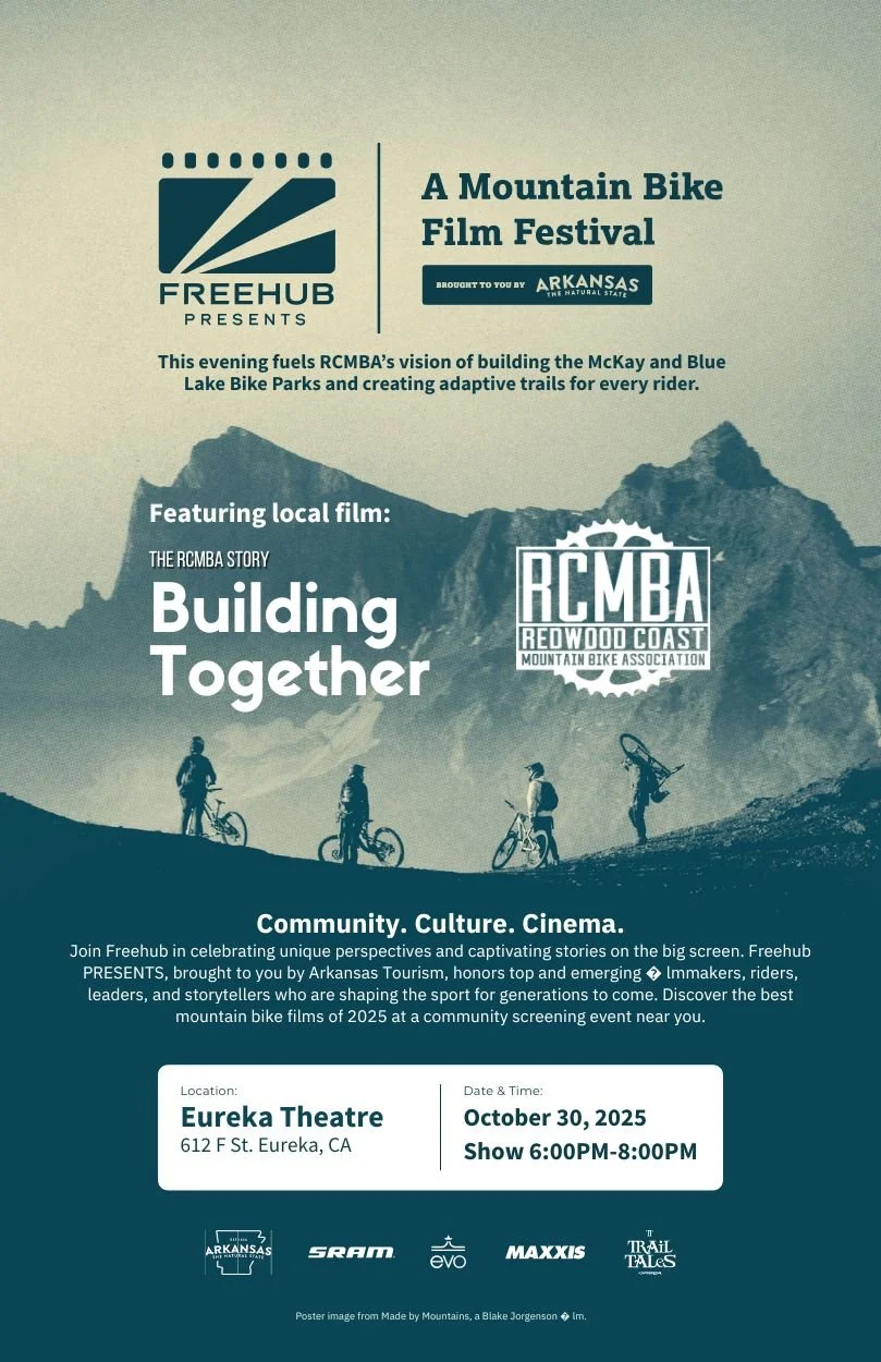 On October 30th, 2025, Humboldt County will host FREEHUB PRESENTS, the national film festival by Freehub Magazine that celebrates mountain bike culture and supports trail building across North America. This special screening doubles as a fundraiser for RCMBA, with proceeds going directly toward building more trails in our region. Headlining the evening is our locally produced feature, “BUILDING TOGETHER: THE RCMBA STORY” a film that tells the true story of community, dirt, and determination behind the Redwood Coast’s growing trail movement. It’s more than a film night—it’s a rally point for riders, builders, and supporters to come together and invest in the future of Humboldt trails.